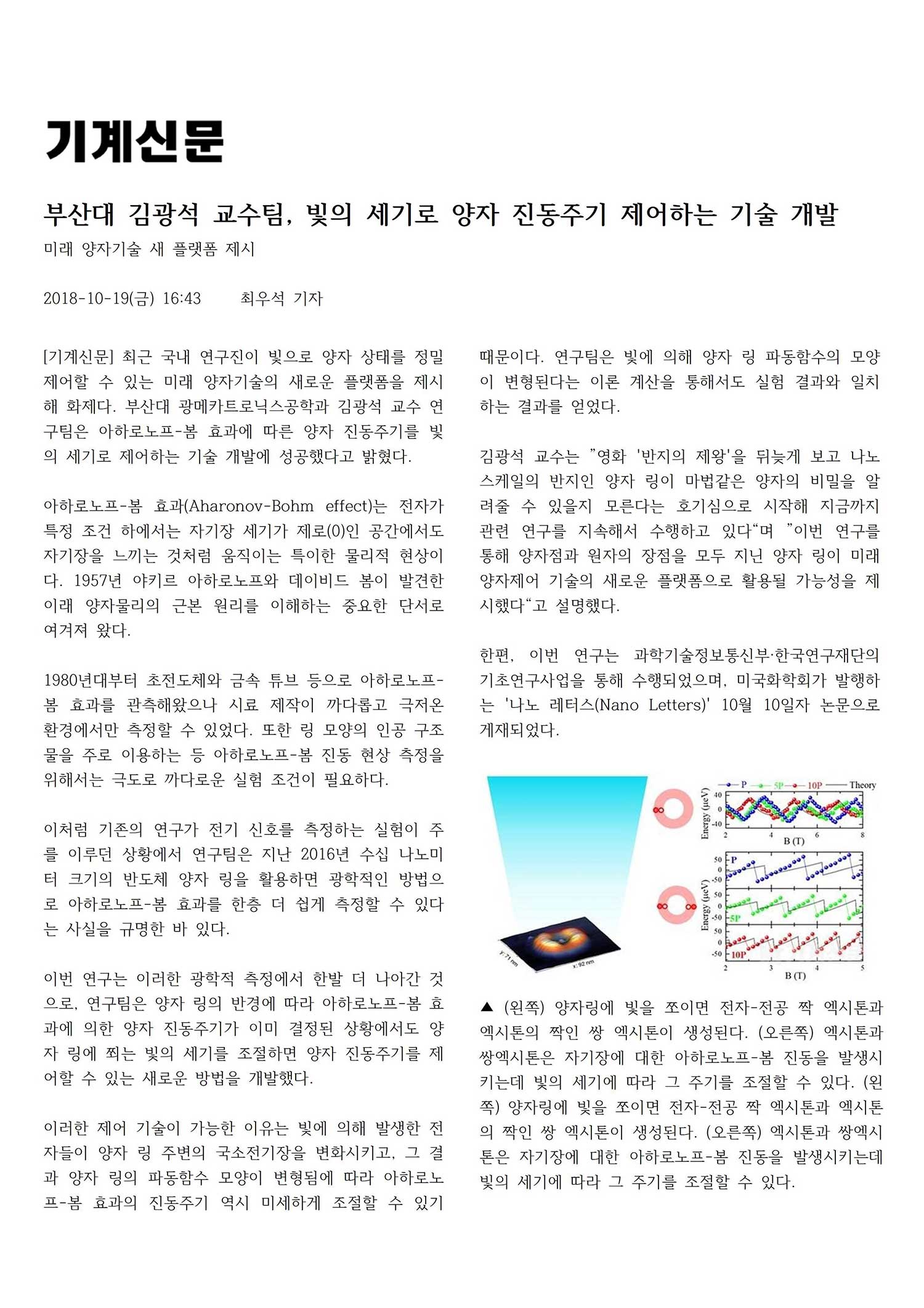 [기계신문] 부산대 김광석교수팀, 빛의 세기로 양자 진동주기 제어하는 기술 개발